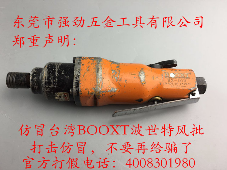 我司旗下BOOXT品牌BX-10H氣動(dòng)螺絲刀風(fēng)批上市十多年,品質(zhì)一直很穩(wěn)定,在市場(chǎng)上已經(jīng)積累了不少粉絲。而最近,我司做售后維修時(shí)發(fā)現(xiàn),有些看起很“真”的BX-10H看起來用了沒多久,卻要維修了,而且客戶明言保修。經(jīng)過簽定才發(fā)現(xiàn),這不過是李鬼而已,品牌標(biāo)識(shí)、烤漆、機(jī)身防偽、工藝等明面上的信息已經(jīng)深深出賣了它。李鬼,對(duì)于終端使用者來講,有時(shí)確實(shí)很難辨認(rèn)。而所購買的氣動(dòng)螺絲刀風(fēng)批是否為正品?能否保證工具品質(zhì),這個(gè)已經(jīng)嚴(yán)重影響了生產(chǎn)秩序。