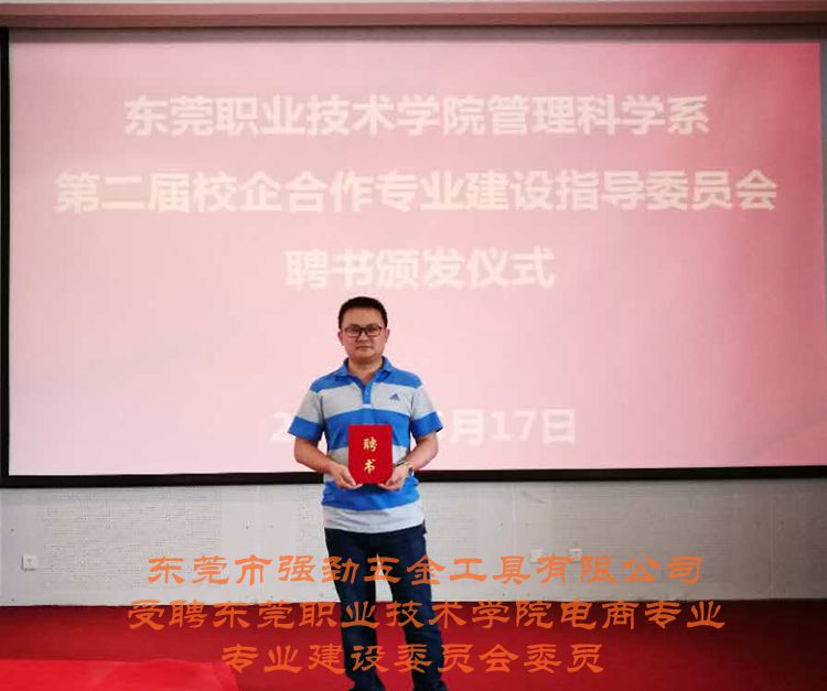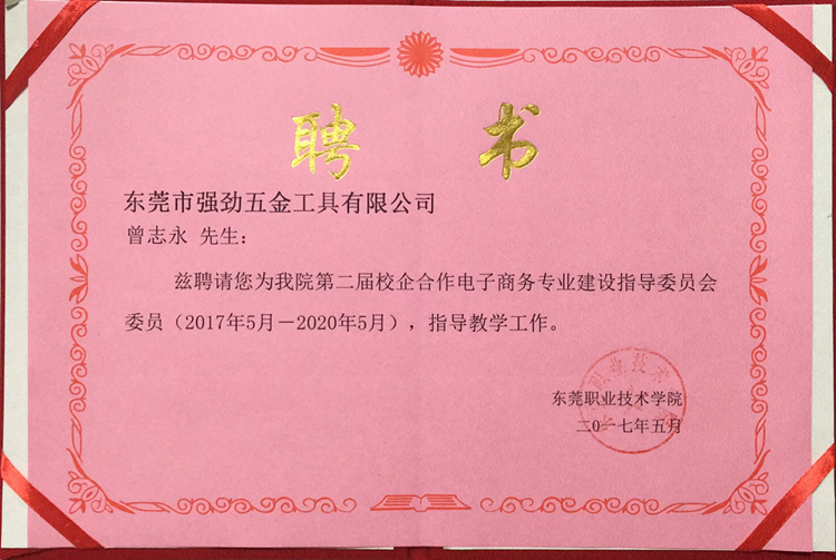 東莞市強(qiáng)勁五金工具有限公司獲得東莞職業(yè)技術(shù)學(xué)院聘書,成為管理科學(xué)系校企合作專業(yè)建設(shè)委員會(huì)委員單位。