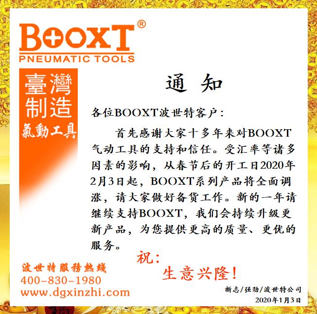 首先感謝大家十多年來對BOOXT氣動(dòng)工具的支持和信任。受匯率等諸多因素的影響,從春節(jié)后的開工日2020年2月3日起,BOOXT系列產(chǎn)品將全面調(diào)漲,請大家做好備貨工作。新的一年請繼續(xù)支持BOOXT,我們會持續(xù)升級更新產(chǎn)品,為您提供更高的質(zhì)量,更優(yōu)的服務(wù)。