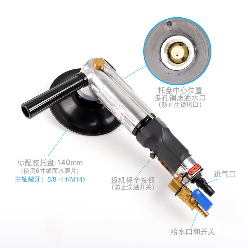 • 產(chǎn)品參數(shù): 托盤尺寸:140mm(M14螺牙);使用磨片:140mm或150mm;轉(zhuǎn)速:11000rpm;長(zhǎng)度:300mm;重量:2.0kg;功率:0.61hp;耗氣量:0.46立方米/分鐘;使用工作氣壓:0.63Mpa;推薦氣管內(nèi)徑8mm;平時(shí)使用應(yīng)多加氣動(dòng)油保養(yǎng)