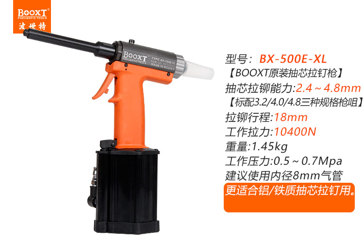 東莞市強(qiáng)勁五金工具有限公司提供臺(tái)灣BOOXT波世特品牌氣動(dòng)工具,細(xì)管氣動(dòng)拉釘槍BX-500E-XL廠家直銷,首件享特價(jià)。咨詢熱線:4008301980