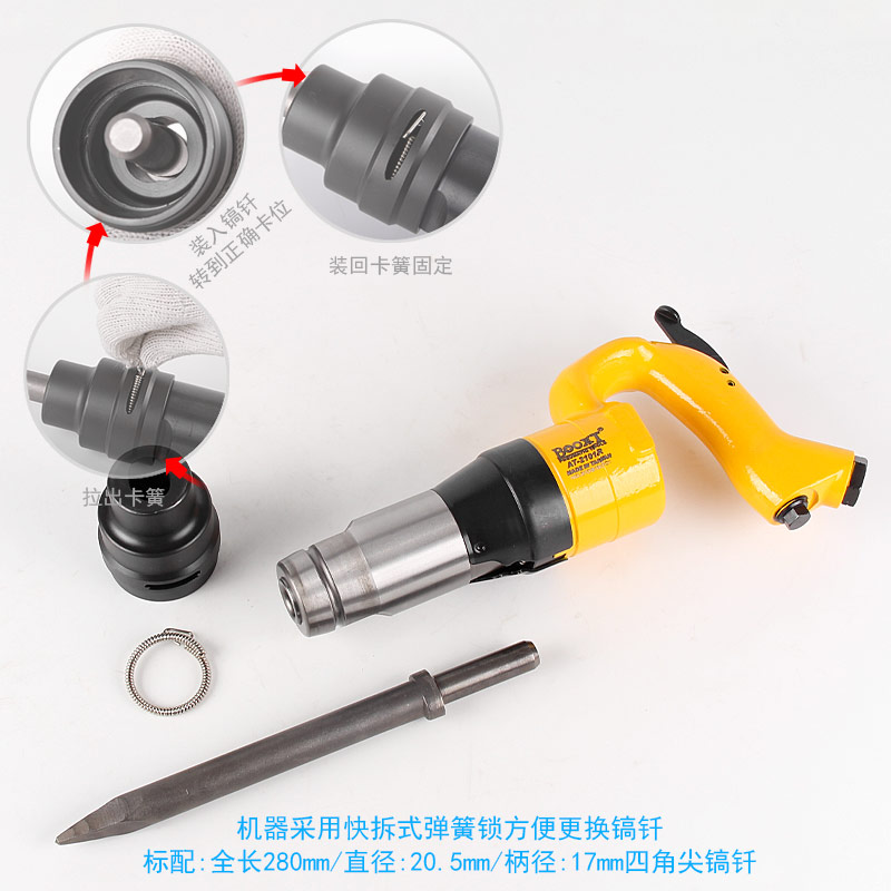 • 產(chǎn)品用途: 配合不同規(guī)格的鏟頭或鎬尖,去除各種附著物如涂料、鐵銹、焊漬、 鑄件剝離、清除水泥、涵洞巖石破碎等作業(yè)。