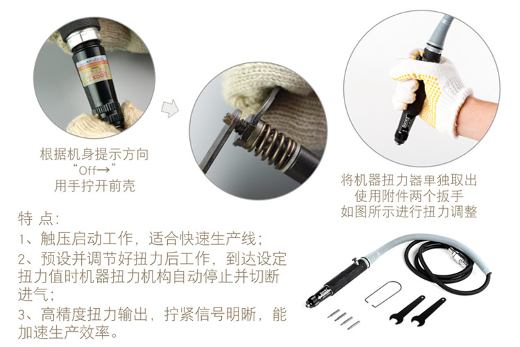 本機(jī)為觸壓?jiǎn)?dòng)式,內(nèi)調(diào)扭力,自動(dòng)斷氣式。