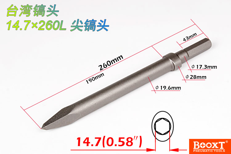 • 產(chǎn)品參數(shù): 鎬頭尺寸:H14.7*260L*25W 【標(biāo)配:扁鎬頭】 活塞直徑:28*93mm 活塞沖程:52mm 打 擊 數(shù):2500bpm 帶鎬全長(zhǎng):547mm 含鎬重量:5.30kg 【六角柄】
