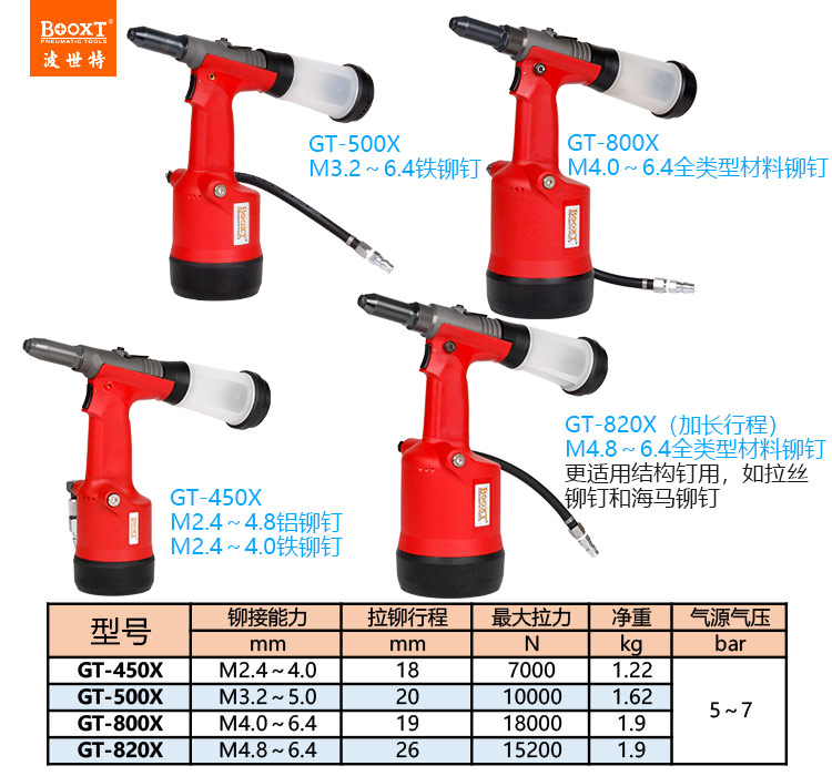 東莞市強勁五金工具有限公司提供臺灣BOOXT波世特品牌氣動工具,氣動拉釘鉚槍GT-500X廠家直銷,首件享特價。咨詢熱線:4008301980