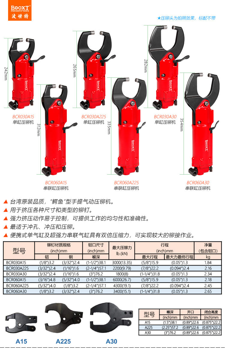 東莞市強(qiáng)勁五金工具有限公司提供臺灣BOOXT波世特品牌氣動工具,鱷魚口氣動壓鉚機(jī)BCR030A15廠家直銷,首件享特價(jià)。咨詢熱線:4008301980