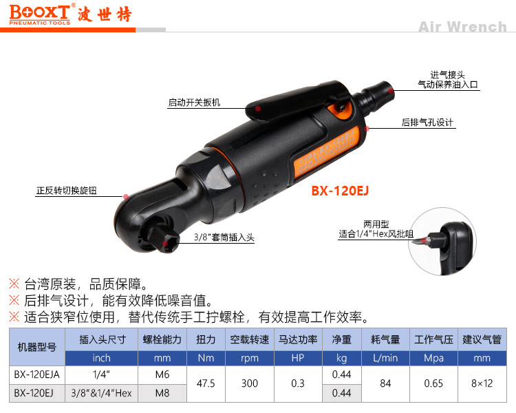 東莞市強勁五金工具有限公司提供臺灣BOOXT波世特品牌氣動工具,兩用氣動棘輪扳手BX-120EJ廠家直銷,首件享特價。咨詢熱線:4008301980