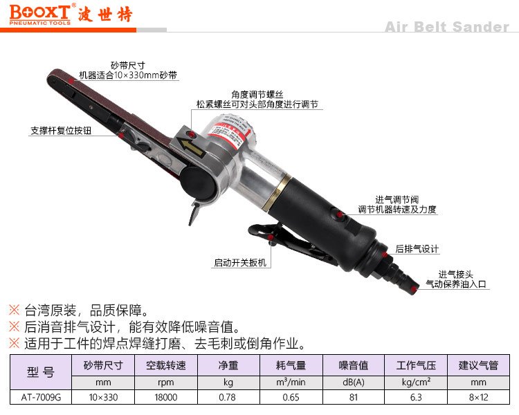 東莞市強(qiáng)勁五金工具有限公司提供臺(tái)灣BOOXT波世特品牌氣動(dòng)工具,AT-7009G圓手柄氣動(dòng)砂帶機(jī)廠家直銷,首件享特價(jià)。服務(wù)熱線:4008301980