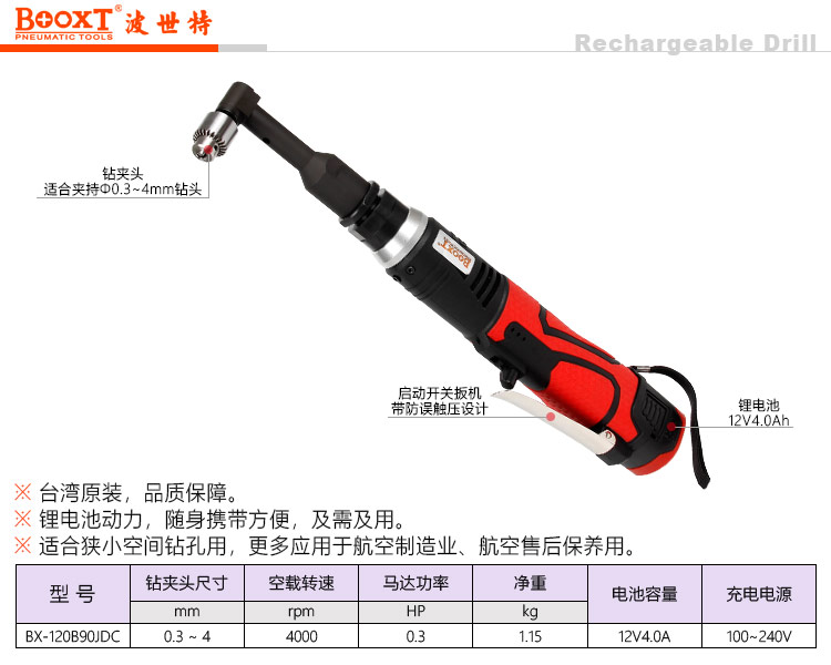 東莞市強勁五金工具有限公司提供臺灣BOOXT波世特品牌五金工具,航空充電彎頭鉆BX-120B90JDC廠家直銷,首件享特價。咨詢熱線:4008301980