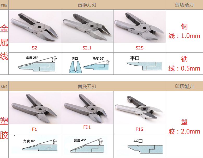 2.注意材質(zhì):材質(zhì)對選配刀刃非常重要,例如客戶要剪的銅鐵、材質(zhì)有鍍鈦、鍍烙、塑料材質(zhì)、加纖維超過20% 時,一般刀刃不是剪不斷,就是使用壽命大大減少,塑料還容易在剪斷過程中碎裂。在這情形S刀刃應選擇Z刀,塑料則建議使用電熱剪。